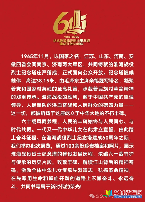 甲子輪回,豐碑永鑄。為隆重紀(jì)念淮海戰(zhàn)役烈士紀(jì)念塔建成開(kāi)放60周年,值此國(guó)慶佳節(jié)來(lái)臨之際,我們隆重推出“人民的豐碑”主題圖片展,重溫這座巍峨身影背后六十年的光輝歷程。展覽將于9月30日烈士紀(jì)念日當(dāng)天,在淮海戰(zhàn)役烈士紀(jì)念塔塔前平臺(tái)、蘇寧廣場(chǎng)、淮塔地鐵站三地同步隆重啟幕。