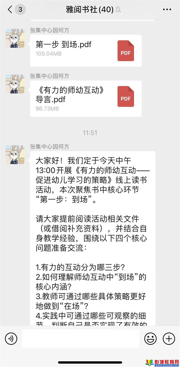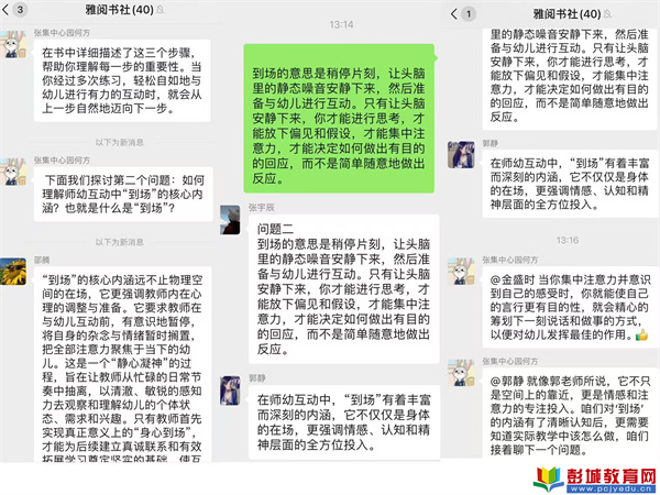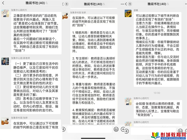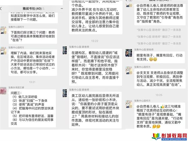 活動(dòng)開始前,張集鎮(zhèn)中心園何方老師在“雅閱書社”群內(nèi)發(fā)布《第一步 到場》《〈有力的師幼互動(dòng)〉導(dǎo)言》等學(xué)習(xí)資料,明確活動(dòng)時(shí)間為當(dāng)天中午13:00,并提出四個(gè)核心研討問題:有力的互動(dòng)分為哪三步?如何理解師幼互動(dòng)中“到場”的核心內(nèi)涵?教師可通過哪些具體策略更好地做到“在場”?實(shí)踐中可通過哪些可觀察的細(xì)節(jié)判斷自己是否實(shí)現(xiàn)了有效的“到場”?引導(dǎo)成員結(jié)合自身教學(xué)經(jīng)驗(yàn)提前準(zhǔn)備,為活動(dòng)開展奠定扎實(shí)基礎(chǔ)。