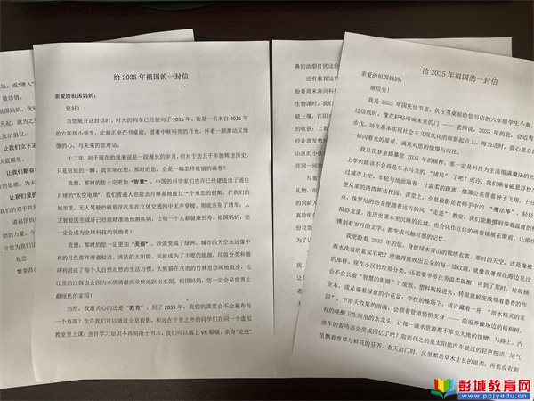 五年級(jí)的“國(guó)慶書簽”設(shè)計(jì)精巧,一枚枚書簽宛如微縮的藝術(shù)品,承載著對(duì)祖國(guó)的美好祝福;“月餅手作”記錄則充滿了勞動(dòng)的香甜,視頻里洋溢的笑臉,作文中細(xì)膩的描寫,都是最真實(shí)的生活體驗(yàn)。六年級(jí)“給2035年祖國(guó)的一封信”更是字字珠璣,篇篇錦繡,同學(xué)們?cè)谛胖袝诚肟萍硷w躍、描繪生態(tài)畫卷、立志報(bào)效國(guó)家,展現(xiàn)了少年一代的遠(yuǎn)大理想與責(zé)任擔(dān)當(dāng)。