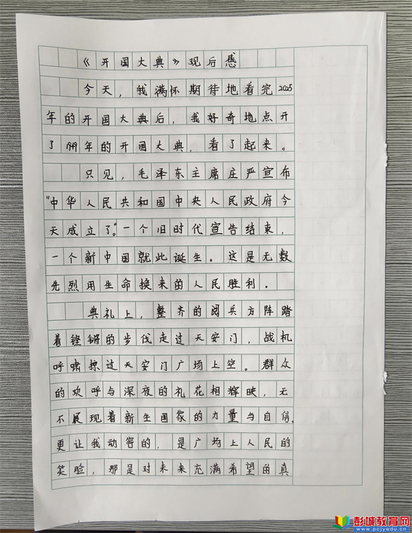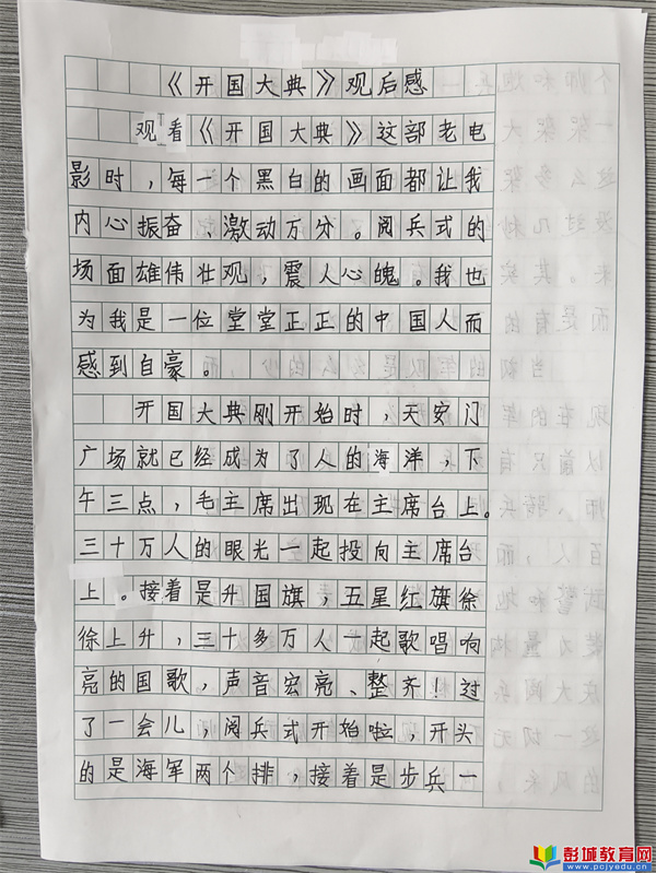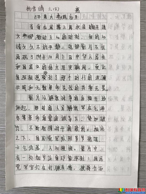 “我看到毛主席按下電鈕,第一面五星紅旗伴著國歌冉冉升起時(shí),我的眼淚都快流出來了。我感覺胸膛里熱熱的,特別自豪!”五年級(3)班的李想同學(xué)在觀后感中這樣寫道。他的真情實(shí)感,代表了大多數(shù)同學(xué)的心聲。