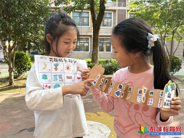 在完成作品后,學(xué)校組織了多種形式的交流活動。課堂上,孩子們圍坐一圈,興奮地介紹自己的創(chuàng)作思路:“我的‘木’字有很多樹枝,因?yàn)榇髽渚褪沁@樣茂盛”“‘火’字的顏色是紅和黃,因?yàn)榛鹧孀顪嘏?。在校園的綠茵下、長廊邊,他們?nèi)宄扇海ハ嘈蕾p、彼此啟發(fā),象形字成為連接彼此的“語言”。這樣的交流不僅鍛煉了學(xué)生的表達(dá)能力,更在輕松自然的氛圍中激發(fā)了他們對漢字學(xué)習(xí)的持續(xù)興趣,實(shí)現(xiàn)了“學(xué)中做、做中思、思中悟”的育人目標(biāo)。