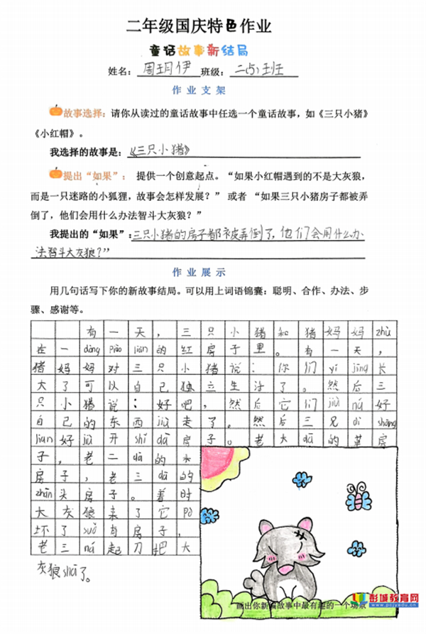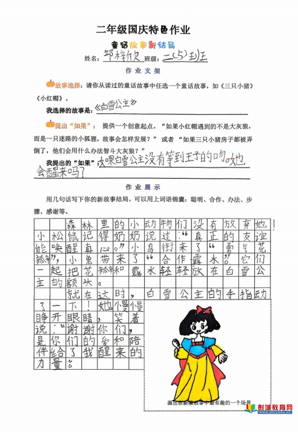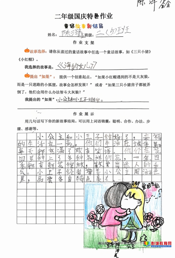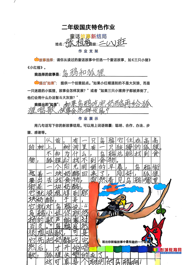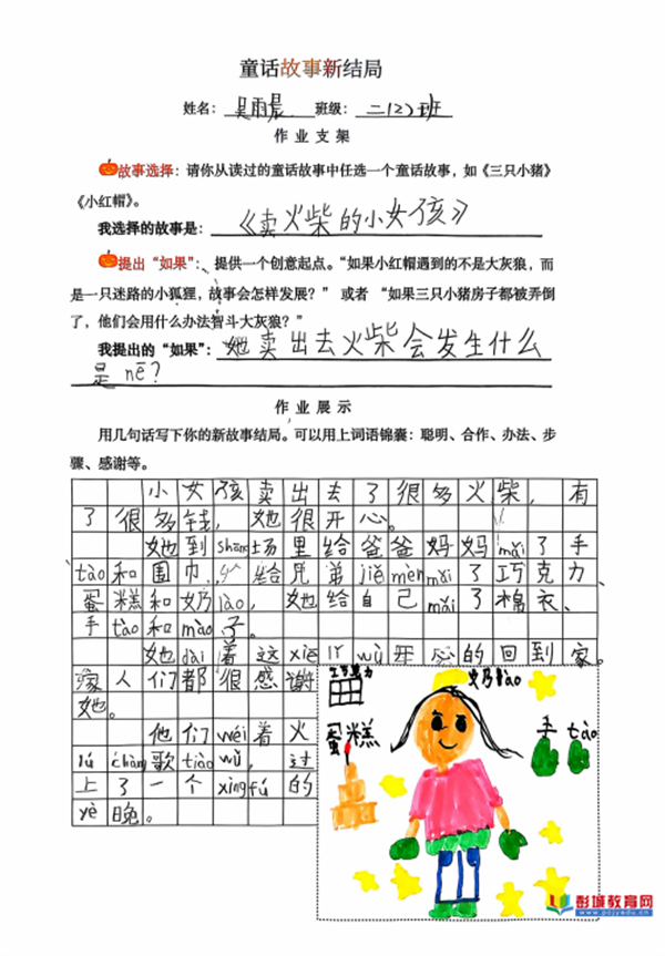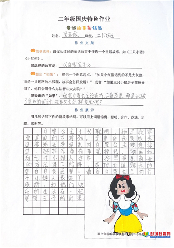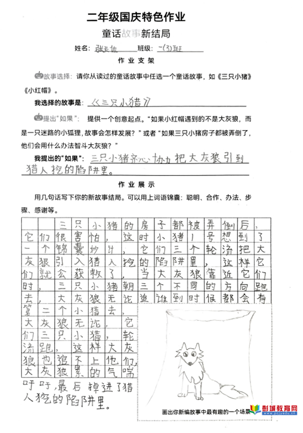 童話故事新結(jié)局:教師巧妙提供“如果……”的創(chuàng)意寫作支架,鼓勵(lì)學(xué)生打破思維定式。在這一框架支持下,孩子們大膽重構(gòu)經(jīng)典,賦予故事新的走向與內(nèi)涵,其邏輯思維與創(chuàng)新想象力在筆下得到自由馳騁。