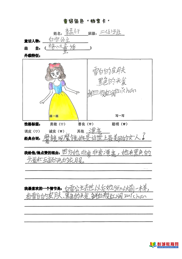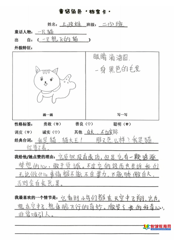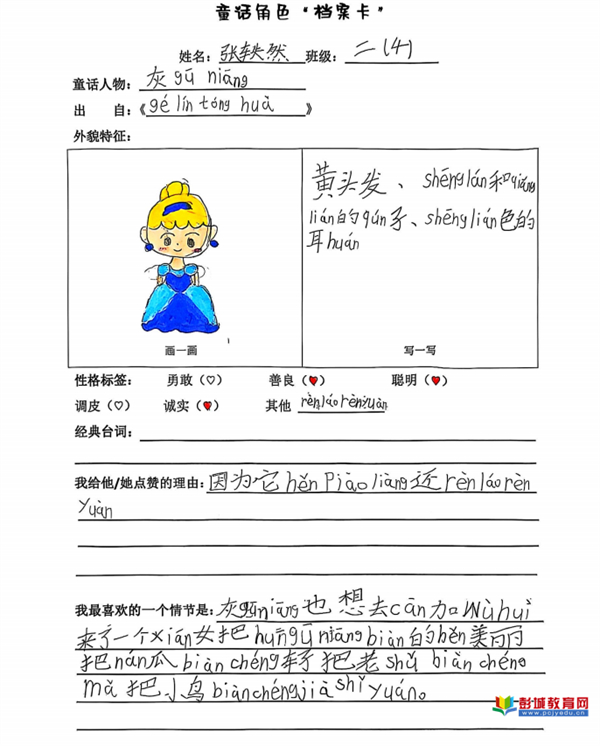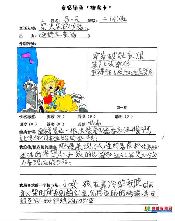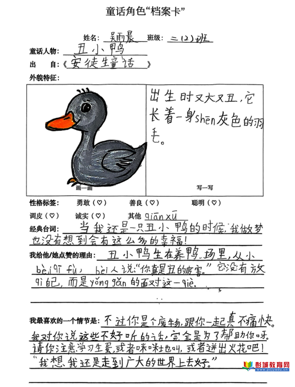 童話角色檔案卡:教師引導(dǎo)學(xué)生超越泛泛而讀,選擇一位角色進(jìn)行深度剖析。通過寫、畫角色形象,摘錄經(jīng)典臺(tái)詞并闡述理由,學(xué)生完成了從感性喜歡到理性分析的跨越,將共情能力與信息整合能力訓(xùn)練落于實(shí)處。