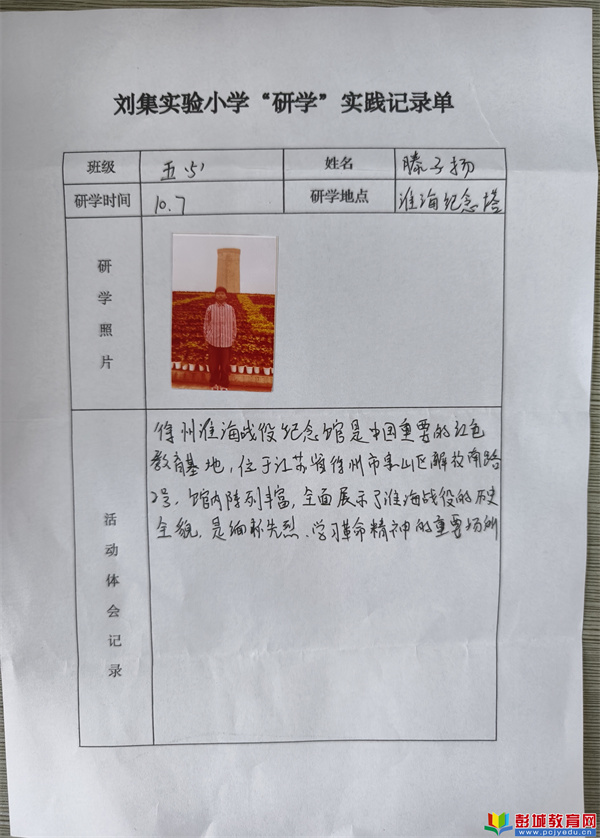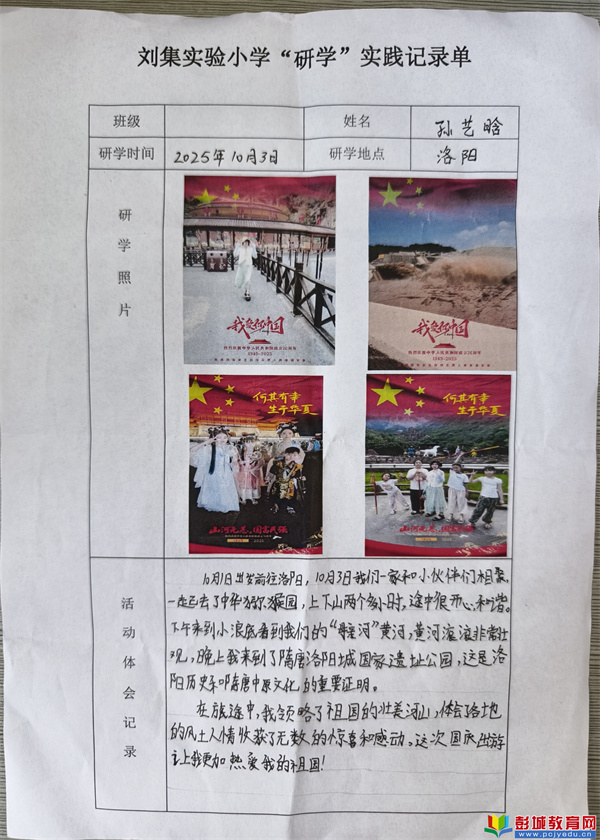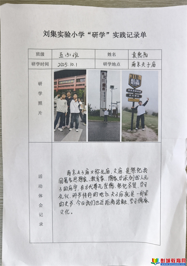 “9·3閱兵之后”,同學(xué)們切實(shí)感受到國家的強(qiáng)大,不僅是軍事力量,更在經(jīng)濟(jì)、政治、科技、文化等諸多領(lǐng)域感受到祖國的全面崛起與繁榮富強(qiáng)。國慶假期,五年級的同學(xué)們在研學(xué)中感受中國的力量,并利用記錄單的形式記錄下自己的感受與思考。走進(jìn)歷史,用腳步丈量革命熱土,用心靈感受英雄氣概,讓愛國情懷悄然生根,讓紅色基因代代相傳。這不僅是一次旅行,更是一堂生動的愛國主義教育課。