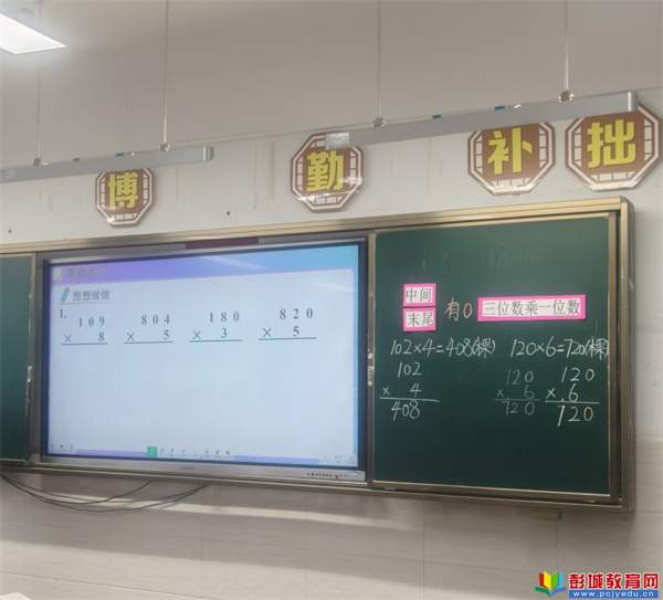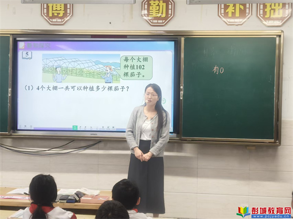 課堂伊始,蔣老師緊扣教材的生活化情境,以“大棚種植茄子和番茄”為切入點:“每個大棚種102棵茄子,4個大棚種多少棵?”“每個大棚種120棵番茄,6個大棚種多少棵?”兩個問題精準(zhǔn)對應(yīng)“中間有0的三位數(shù)乘一位數(shù)(102×4)”和“末尾有0的三位數(shù)乘一位數(shù)(120×6)”,既還原教材例題場景,又激發(fā)學(xué)生探究欲,學(xué)生們迅速進入思考狀態(tài)。