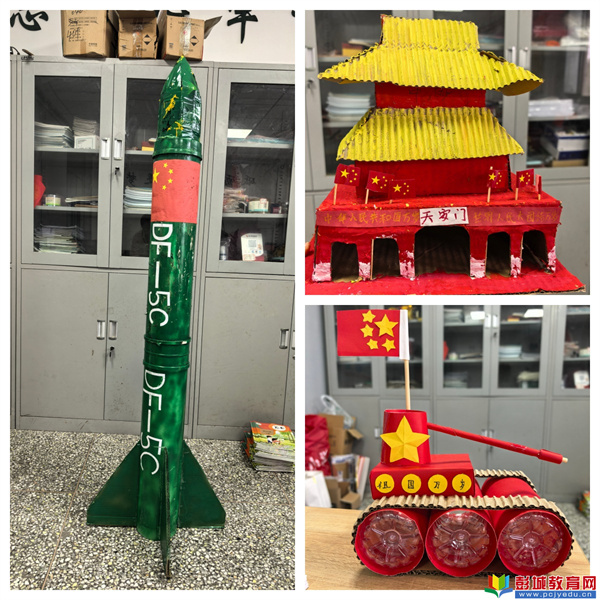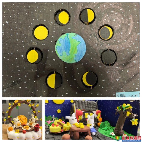 中年級的手工制作比賽熱鬧非凡。孩子們用靈巧的雙手,將對祖國的熱愛與對中秋的期盼融入作品:天安門城樓莊嚴肅穆,軍綠色的火箭直指蒼穹,仿佛在訴說航天夢;橡皮泥捏制的玉兔、月餅、燈籠則憨態(tài)可掬,傳遞著中秋的團圓意韻。