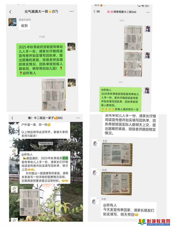 班級宣傳:教師利用家長會、家園聯(lián)系欄、班級微信群,向幼兒及家長發(fā)放資助政策手冊等,以通俗的語言解讀申報條件、材料要求及幫扶內(nèi)容,確保家長清晰知曉政策細(xì)節(jié)。