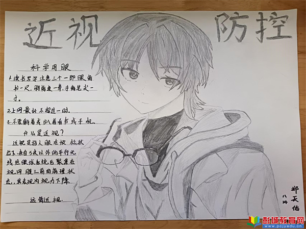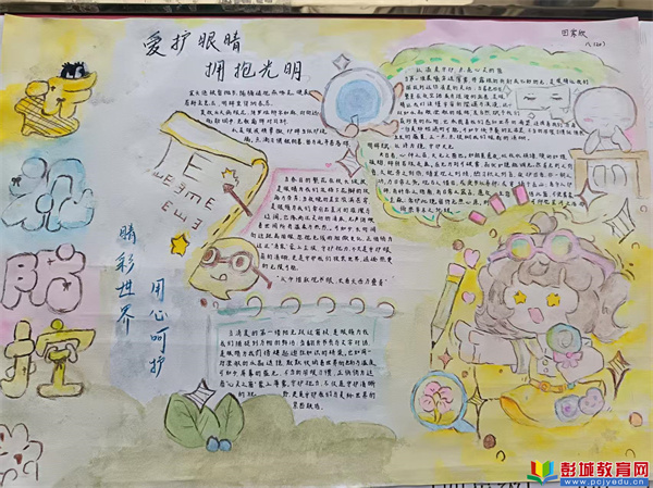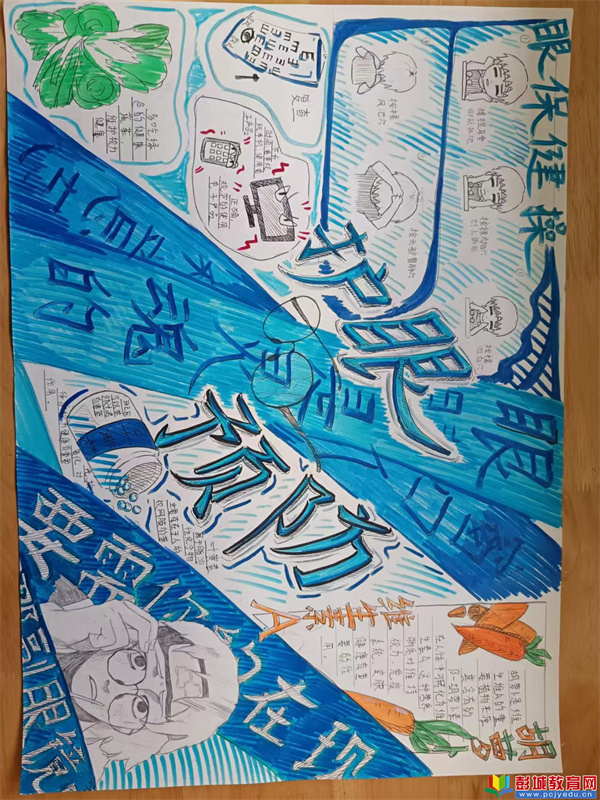 內(nèi)容編排上,同學(xué)們更是細(xì)致用心。他們或講解近視成因,科普“讀寫姿勢三個(gè)一”(眼離書一尺、胸離桌一拳、手離筆尖一寸)、“上網(wǎng)時(shí)長不超一小時(shí)”等用眼規(guī)范;或分享眼保健操的正確做法,介紹胡蘿卜、青菜等護(hù)眼食材的營養(yǎng)功效;還結(jié)合視力表、眼鏡等視覺符號(hào),生動(dòng)傳遞“愛護(hù)視力要從日常點(diǎn)滴做起”的理念。每一份手抄報(bào)都是同學(xué)們對(duì)愛眼護(hù)眼知識(shí)的系統(tǒng)梳理,字里畫間滿是他們對(duì)清晰視界的珍視與追求。