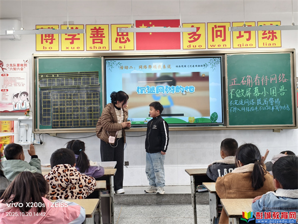 在“網(wǎng)絡(luò)魅力惹人愛”環(huán)節(jié),師生共同探討手機(jī)與網(wǎng)絡(luò)的利弊。大家紛紛發(fā)言:“網(wǎng)絡(luò)能查學(xué)習(xí)資料,方便又快捷”“可以和遠(yuǎn)方的親人視頻通話”,也有人坦言“有的同學(xué)總刷短視頻忘了寫作業(yè)”“過度玩手機(jī)會影響視力”。在思辨中,同學(xué)們逐漸明白,網(wǎng)絡(luò)是工具而非玩具,關(guān)鍵在于如何使用。