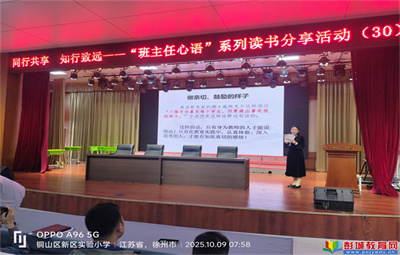 彭城教育:2025年10月9日,銅山區(qū)新區(qū)實驗小學(xué)班主任分享第30期活動在學(xué)校報告廳開展,朱海寧老師結(jié)合于永正的《做一個學(xué)生喜歡的老師——我的為師之道》一書分享如何做一個學(xué)生喜歡的老師。首